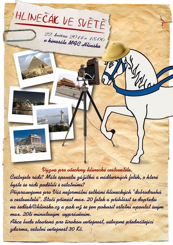 Pro velký úspěch jsme se rozhodli uspořádat druhé neformální setkání hlinečáků, kteří rádi cestují a poznávají cizí kraje. Podzimní posezení proběhlo sice za malé účasti veřejnosti, ale bylo velice příjemné a zajímavé. Rádi bychom pozvali všechny hlinečáky i nehlinečáky, kteří navštívili nějakou pozoruhodnou zemi, aby se přišli podělit o zážitky a fotografie s ostatními cestovateli a veřejností. Pravidla jsou jednoduchá. Každý cestovatel má k dispozici 20 minut času na krátké povídání, při kterém může předvést maximálně 20 snímků ze svých cest. Hlásit se můžete už ode dneška na sedlak@hlinsko.cz.